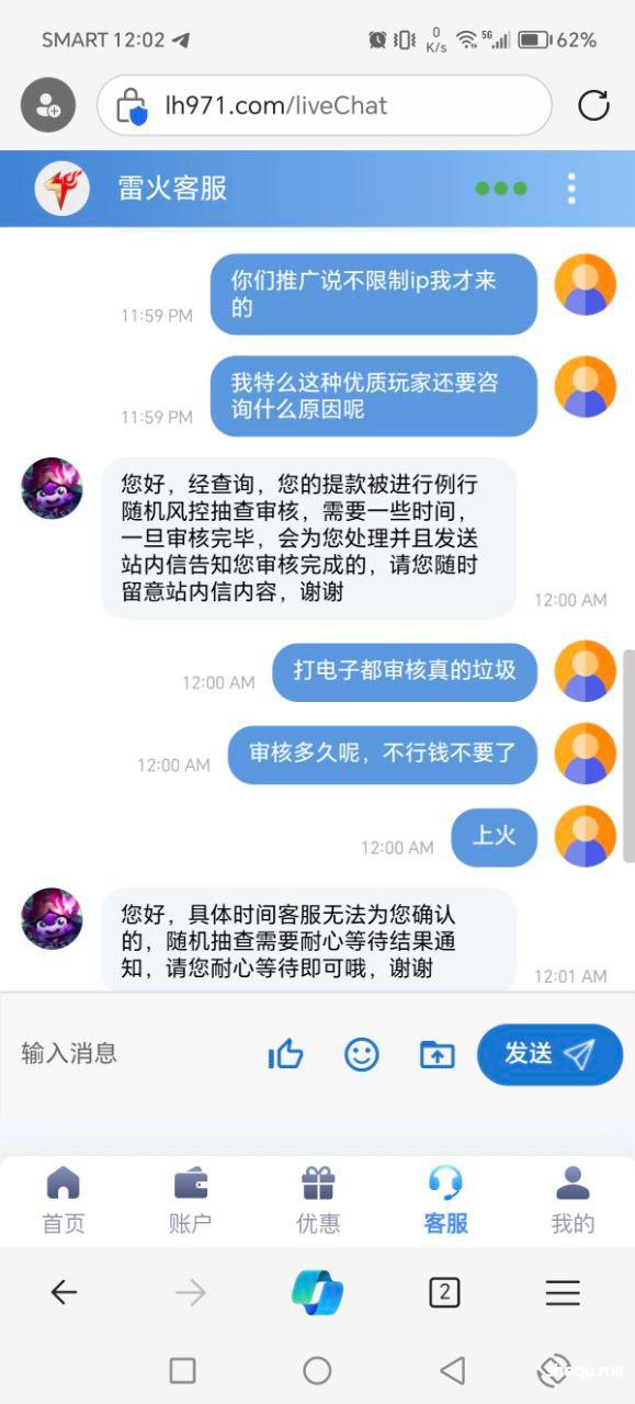 本人在菲做点小生意,唯一的爱好就是每天打点转转,今天经电报介绍去雷火平台, 充值300打麻2拉到1500提款半小时没到账去咨询客服,客服回复随机抽查请耐心等待结果!本人没领过任何彩金,也是第一次在雷火娱乐。赌友圈流行一句话,电子都卡的台子绝对是垃圾台子!本人在开云系列台,bm体育,球速体育等娱乐过很久,账号相同可查,重未发生过此类扎心的问题!忘广大网友远离黑平台,还网赌圈一份宁静,最后说一句,真的狠搞心态!